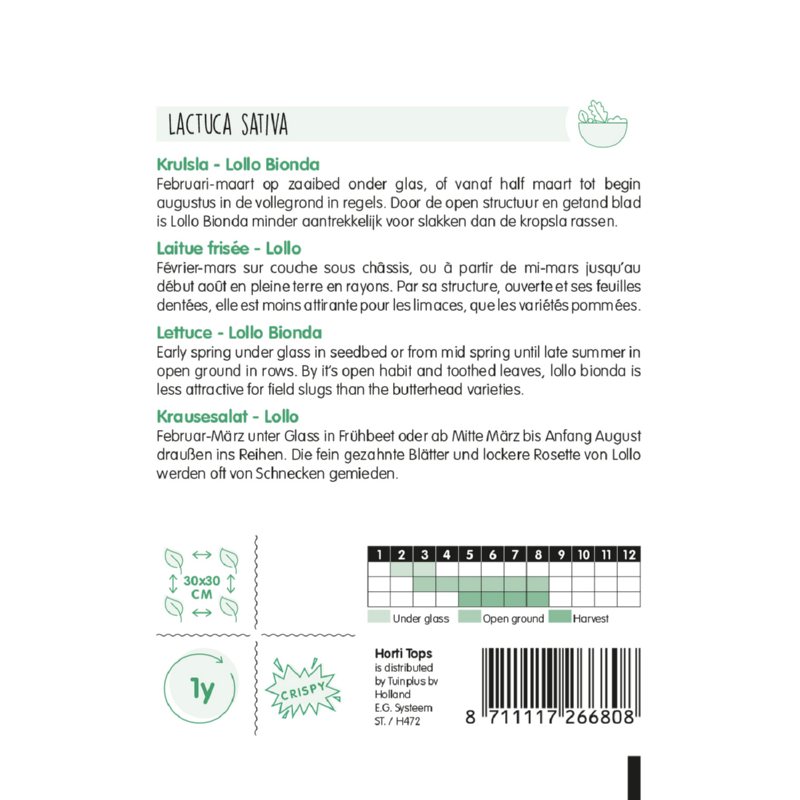 Februari-maart op zaaibed onder glas, of vanaf half maart tot begin augustus in de vollegrond in regels. Door de open structuur en getand blad is Lollo Bionda minder aantrekkelijk voor slakken dan de kropsla rassen.