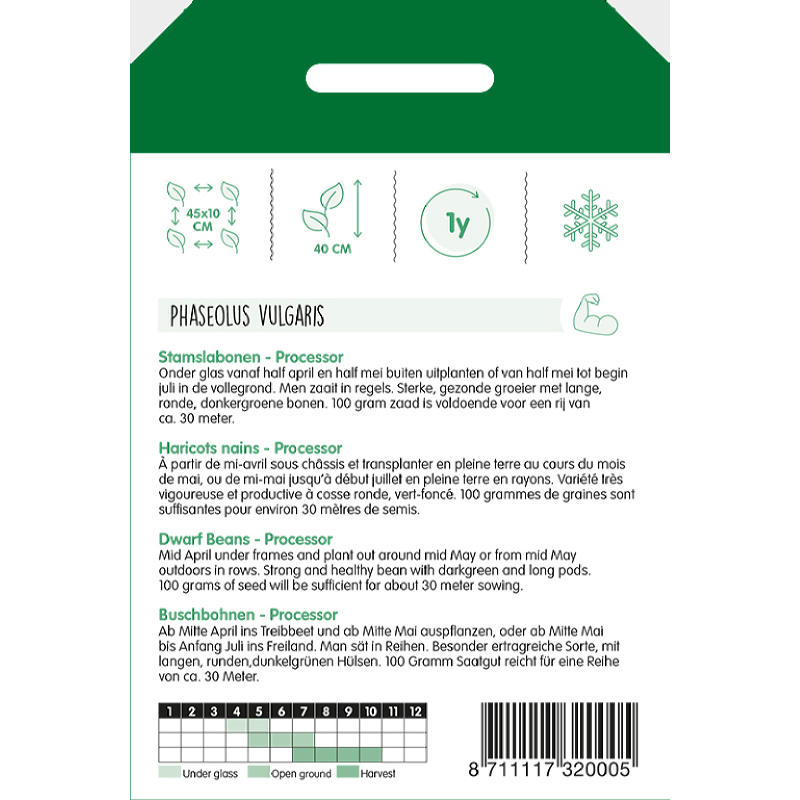 Onder glas vanaf half april en half mei buiten uitplanten of van half mei tot begin juli in de vollegrond. Men zaait in regels. Sterke, gezonde groeier met lange, ronde, donkergroene bonen.